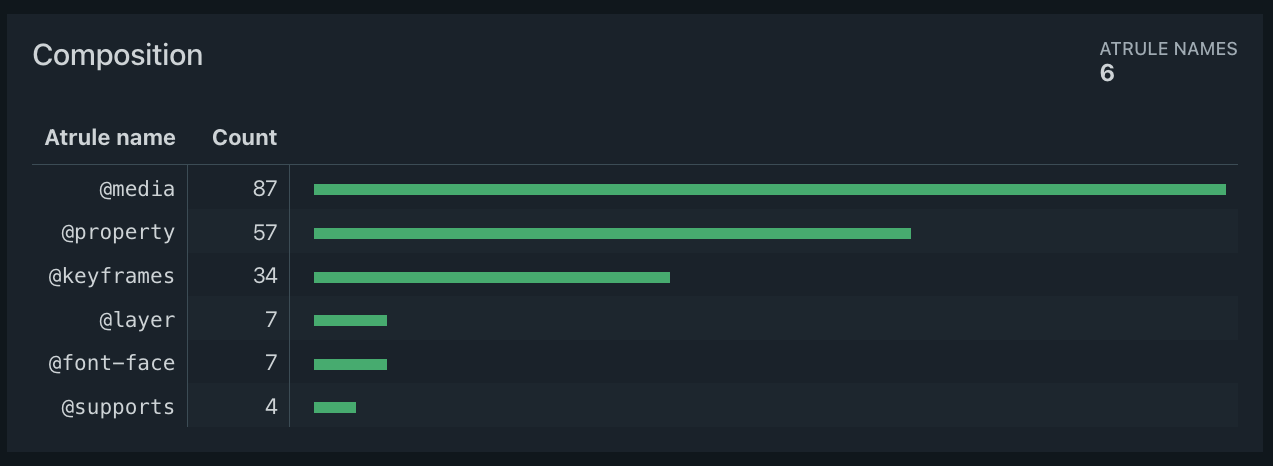 For a quick overview of what your atrule game looks like you can look at the new atrules composition chart. It shows an overview of which atrule was used how often. Neat way to get a quick view of the landscape before you dive deeper.