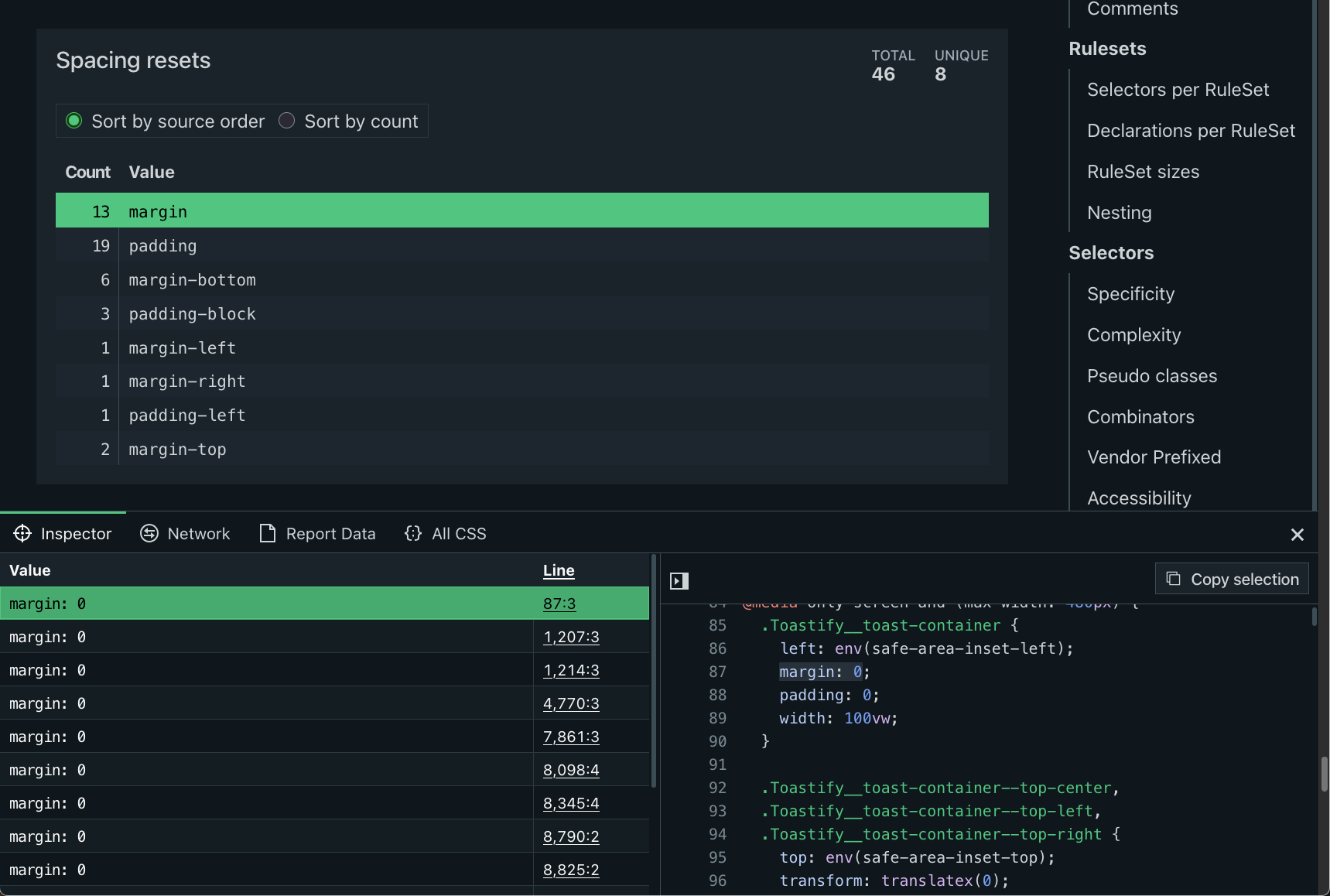 Sparked by Ana Rodrigues’ talk on CSS Day which showed that she used Project Wallace (yay!) and CSSStats for auditing purposes. Turns out CSSStats does CSS resets analysis which we didn’t offer before. Now we do (since @projectwallace/css-analyzer@7.2.0) with some improvements over CSSStats’ implementation: